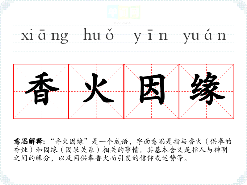 “香火因缘”是一个成语,字面意思是指与香火(供奉的香烛)和因缘(因果关系)相关的事情。其基本含义是指人与神明之间的缘分,以及因供奉香火而引发的信仰或运势等。