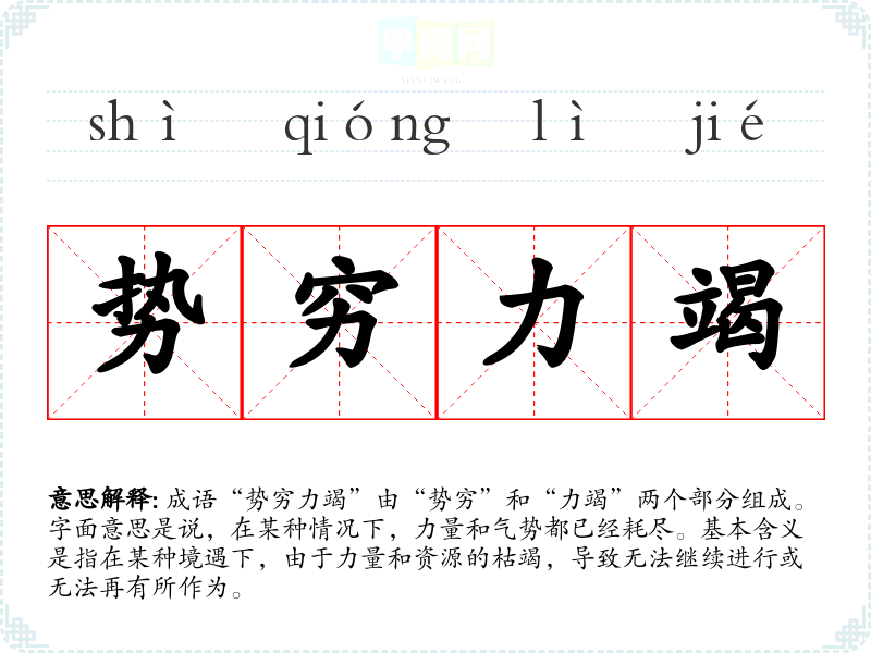 成语“势穷力竭”由“势穷”和“力竭”两个部分组成。字面意思是说,在某种情况下,力量和气势都已经耗尽。基本含义是指在某种境遇下,由于力量和资源的枯竭,导致无法继续进行或无法再有所作为。