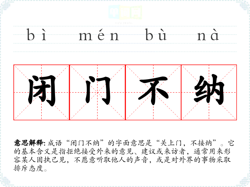 成语“闭门不纳”的字面意思是“关上门,不接纳”。它的基本含义是指拒绝接受外来的意见、建议或来访者,通常用来形容某人固执己见,不愿意听取他人的声音,或是对外界的事物采取排斥态度。