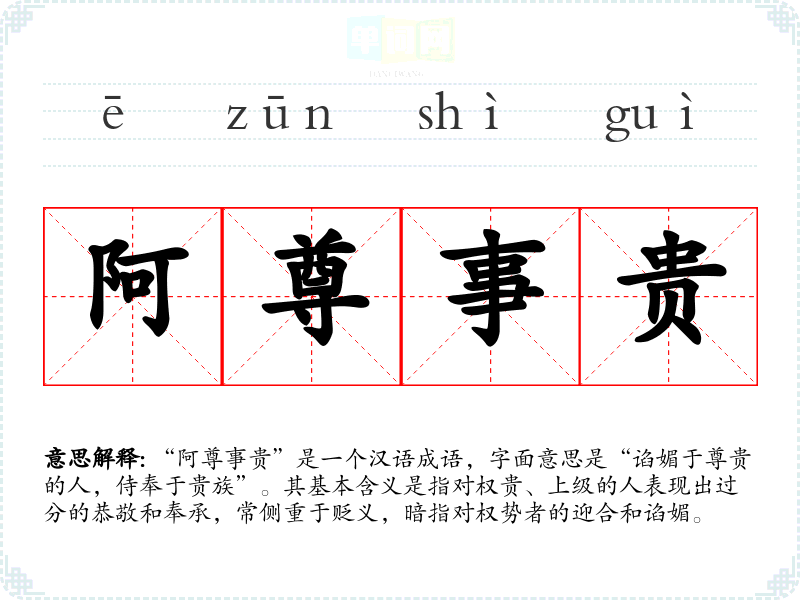 “阿尊事贵”是一个汉语成语,字面意思是“谄媚于尊贵的人,侍奉于贵族”。其基本含义是指对权贵、上级的人表现出过分的恭敬和奉承,常侧重于贬义,暗指对权势者的迎合和谄媚。