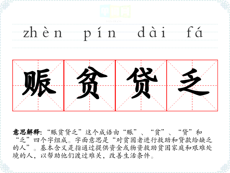 “赈贫贷乏”这个成语由“赈”、“贫”、“贷”和“乏”四个字组成。字面意思是“对贫困者进行救助和贷款给缺乏的人”。基本含义是指通过提供资金或物资救助贫困家庭和艰难处境的人,以帮助他们渡过难关,改善生活条件。