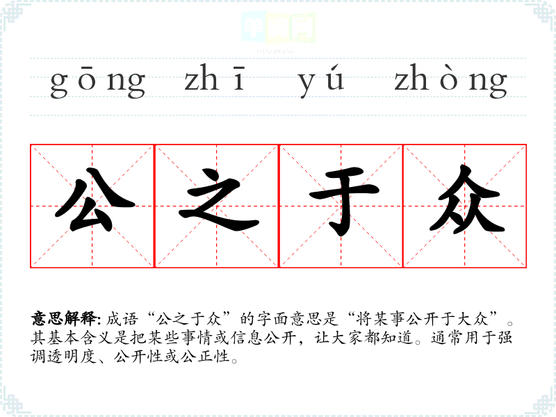 成语“公之于众”的字面意思是“将某事公开于大众”。其基本含义是把某些事情或信息公开,让大家都知道。通常用于强调透明度、公开性或公正性。