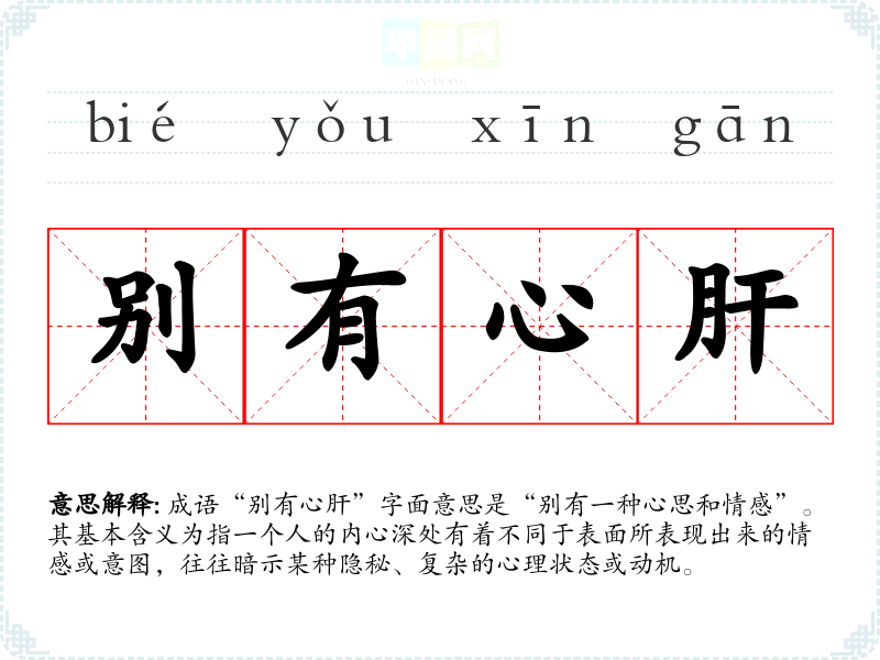 成语“别有心肝”字面意思是“别有一种心思和情感”。其基本含义为指一个人的内心深处有着不同于表面所表现出来的情感或意图,往往暗示某种隐秘、复杂的心理状态或动机。