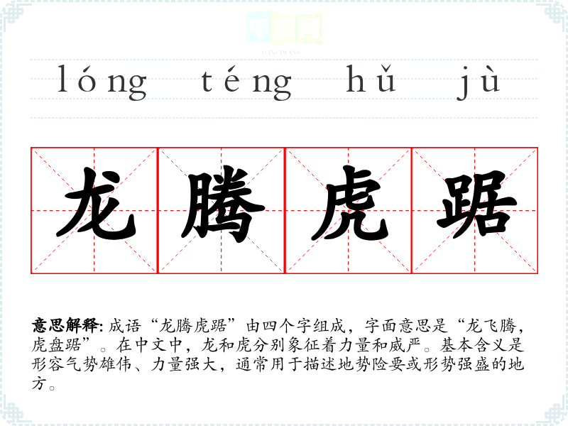 成语“龙腾虎踞”由四个字组成,字面意思是“龙飞腾,虎盘踞”。在中文中,龙和虎分别象征着力量和威严。基本含义是形容气势雄伟、力量强大,通常用于描述地势险要或形势强盛的地方。