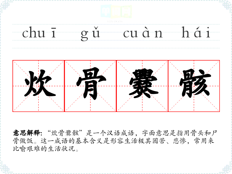 “炊骨爨骸”是一个汉语成语,字面意思是指用骨头和尸骨做饭。这一成语的基本含义是形容生活极其困苦、悲惨,常用来比喻艰难的生活状况。
