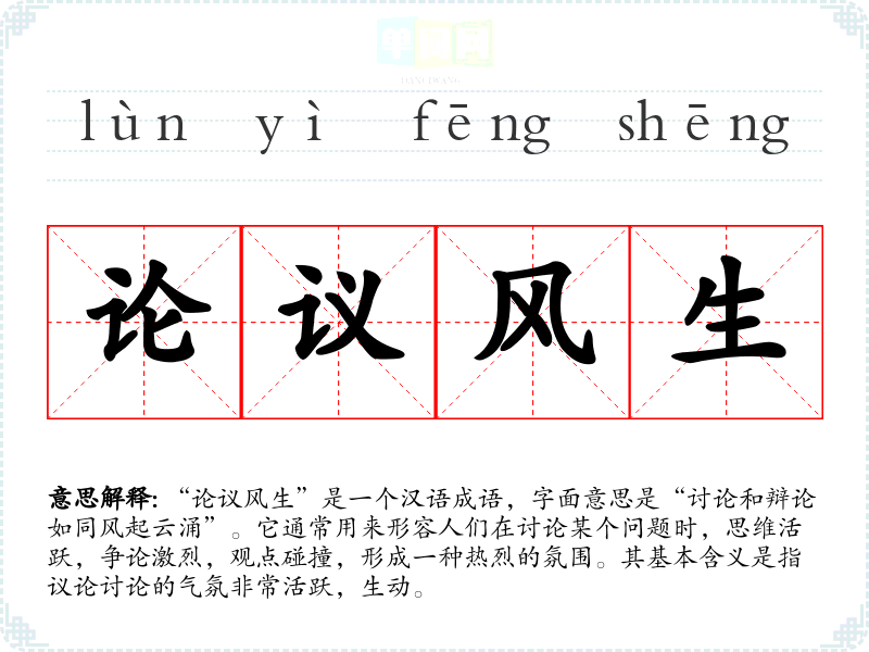 “论议风生”给人一种积极向上的感觉,代表着思想的碰撞与交流,让人联想到智者之间的争辩和对真理的追求。这种情感反应激励着我们在日常生活中积极参与讨论,分享观点。