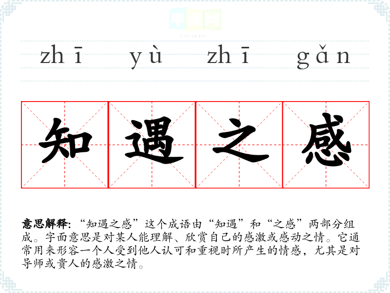 “知遇之感”这个成语由“知遇”和“之感”两部分组成。字面意思是对某人能理解、欣赏自己的感激或感动之情。它通常用来形容一个人受到他人认可和重视时所产生的情感,尤其是对导师或贵人的感激之情。