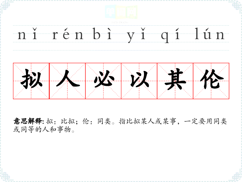 | 拟人必以其伦 | 拟:比拟;伦:同类。指比拟某人或某事,一定要用同类或同等的人和事物。 |