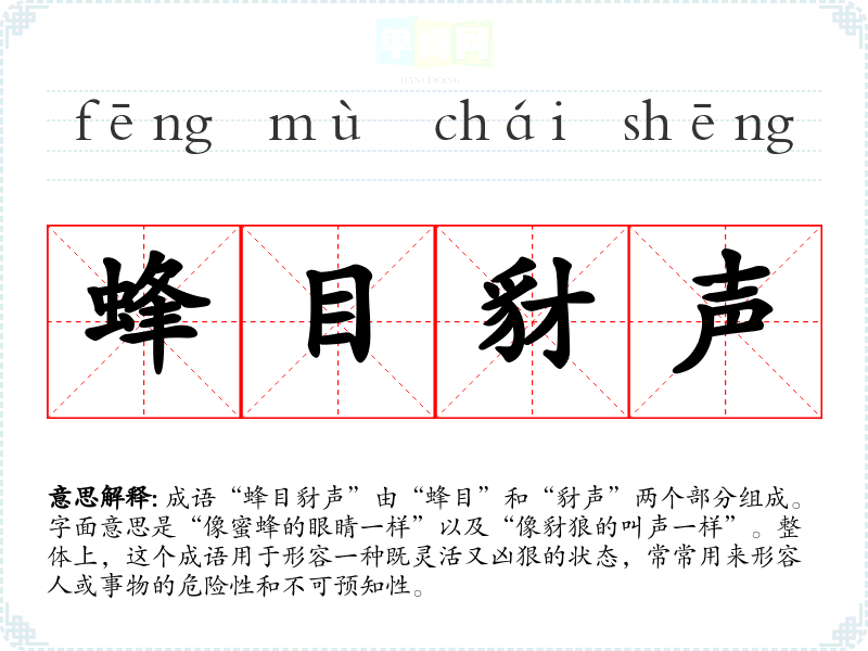 成语“蜂目豺声”由“蜂目”和“豺声”两个部分组成。字面意思是“像蜜蜂的眼睛一样”以及“像豺狼的叫声一样”。整体上,这个成语用于形容一种既灵活又凶狠的状态,常常用来形容人或事物的危险性和不可预知性。
