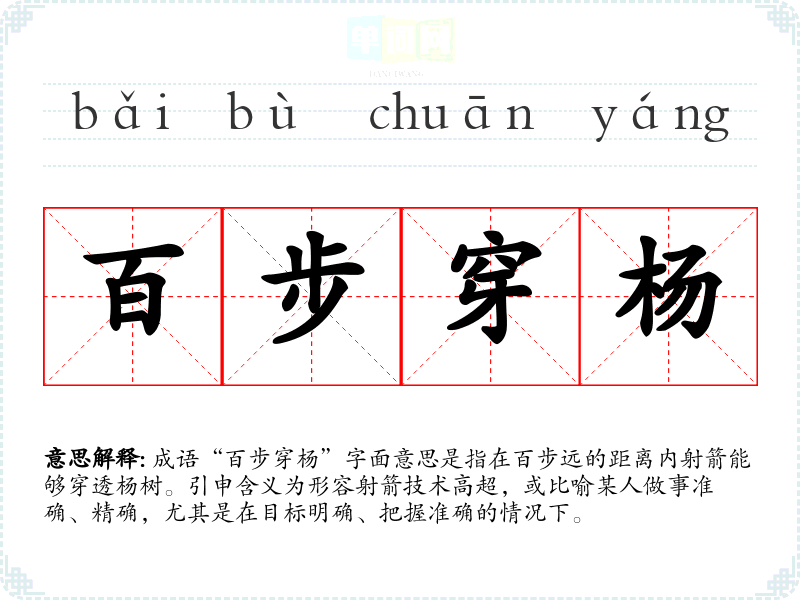 成语“百步穿杨”字面意思是指在百步远的距离内射箭能够穿透杨树。引申含义为形容射箭技术高超,或比喻某人做事准确、精确,尤其是在目标明确、把握准确的情况下。