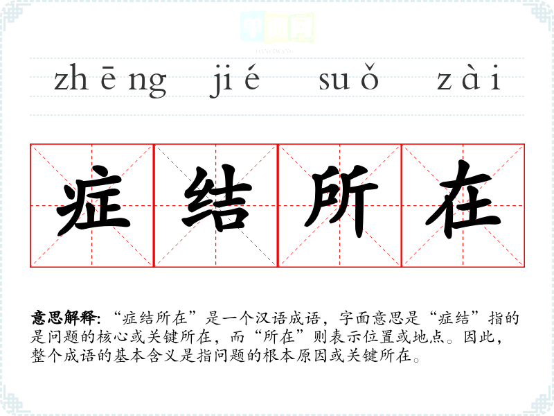 “症结所在”是一个汉语成语,字面意思是“症结”指的是问题的核心或关键所在,而“所在”则表示位置或地点。因此,整个成语的基本含义是指问题的根本原因或关键所在。