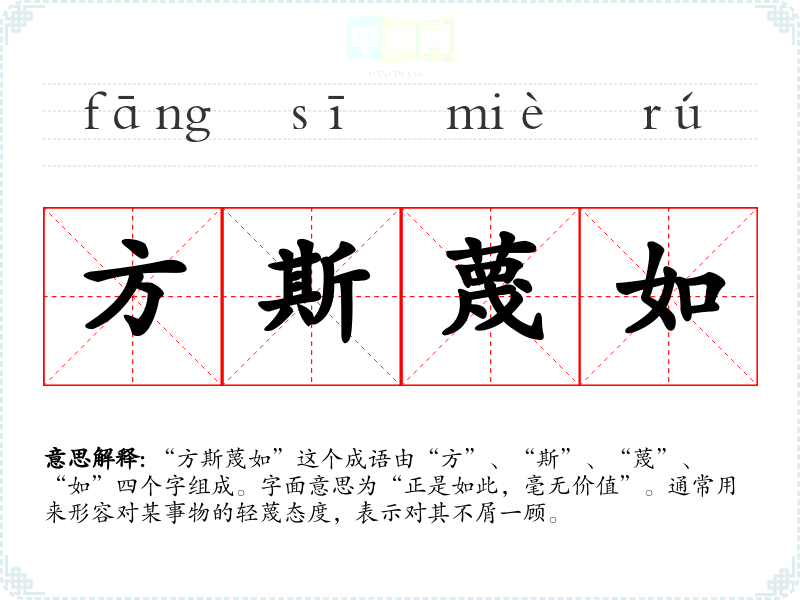 “方斯蔑如”这个成语由“方”、“斯”、“蔑”、“如”四个字组成。字面意思为“正是如此,毫无价值”。通常用来形容对某事物的轻蔑态度,表示对其不屑一顾。