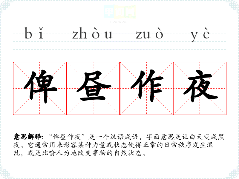 “俾昼作夜”是一个汉语成语,字面意思是让白天变成黑夜。它通常用来形容某种力量或状态使得正常的日常秩序发生混乱,或是比喻人为地改变事物的自然状态。
