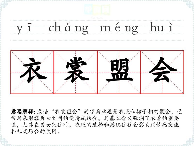 成语“衣裳盟会”的字面意思是衣服和裙子相约聚会,通常用来形容男女之间的爱情或约会。其基本含义强调了衣着的重要性,尤其在男女交往时,衣服的选择和搭配往往会影响到情感交流和社交场合的氛围。