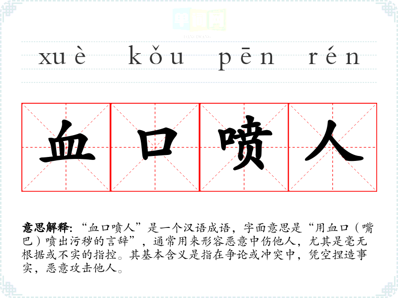 “血口喷人”是一个汉语成语,字面意思是“用血口(嘴巴)喷出污秽的言辞”,通常用来形容恶意中伤他人,尤其是毫无根据或不实的指控。其基本含义是指在争论或冲突中,凭空捏造事实,恶意攻击他人。