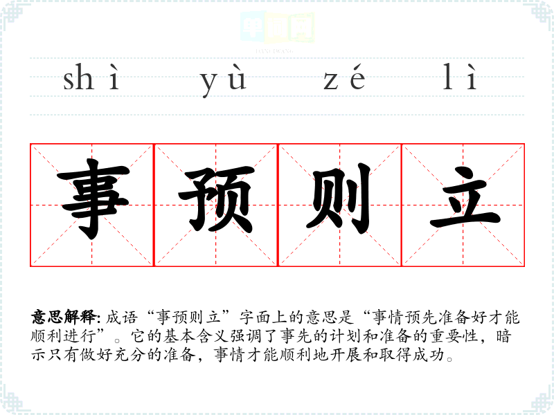 成语“事预则立”字面上的意思是“事情预先准备好才能顺利进行”。它的基本含义强调了事先的计划和准备的重要性,暗示只有做好充分的准备,事情才能顺利地开展和取得成功。
