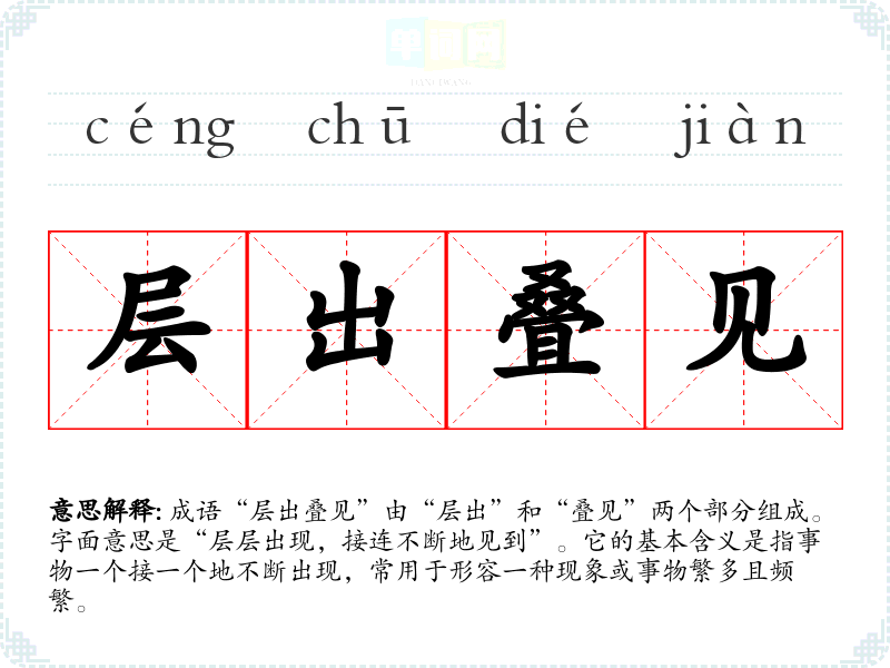 成语“层出叠见”由“层出”和“叠见”两个部分组成。字面意思是“层层出现,接连不断地见到”。它的基本含义是指事物一个接一个地不断出现,常用于形容一种现象或事物繁多且频繁。