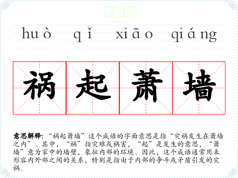 “祸起萧墙”这个成语的字面意思是指“灾祸发生在萧墙之内”。其中,“祸”指灾难或祸害,“起”是发生的意思,“萧墙”意为家中的墙壁,象征内部的环境。因此,这个成语通常用来形容内外部之间的关系,特别是指由于内部的争斗或矛盾引发的灾祸。