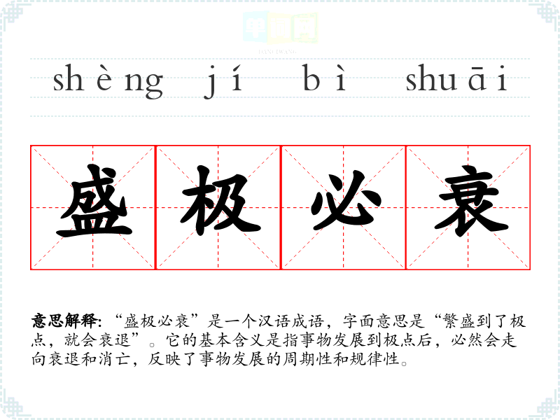 “盛极必衰”是一个汉语成语,字面意思是“繁盛到了极点,就会衰退”。它的基本含义是指事物发展到极点后,必然会走向衰退和消亡,反映了事物发展的周期性和规律性。