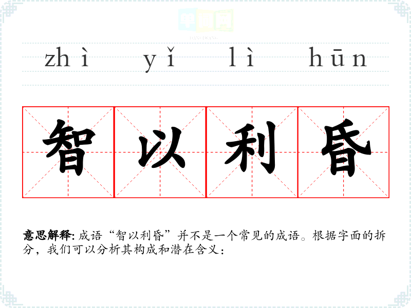 成语“智以利昏”并不是一个常见的成语。根据字面的拆分,我们可以分析其构成和潜在含义:
