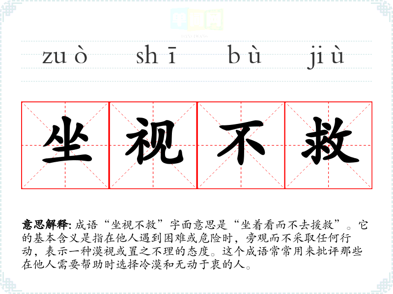 成语“坐视不救”字面意思是“坐着看而不去援救”。它的基本含义是指在他人遇到困难或危险时,旁观而不采取任何行动,表示一种漠视或置之不理的态度。这个成语常常用来批评那些在他人需要帮助时选择冷漠和无动于衷的人。