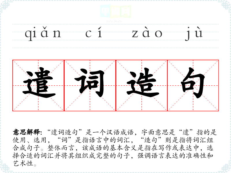 “遣词造句”是一个汉语成语,字面意思是“遣”指的是使用、选用,“词”是指语言中的词汇,“造句”则是指将词汇组合成句子。整体而言,该成语的基本含义是指在写作或表达中,选择合适的词汇并将其组织成完整的句子,强调语言表达的准确性和艺术性。