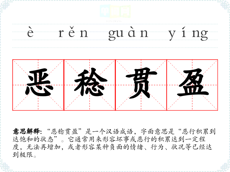 该成语可能源于对恶行积累、结果的思考,强调恶行的不可持续性和最终的结果。尽管在古代文献中并没有明确的出处,成语的构成部分“恶稔”可以理解为“恶事的积累”,“贯盈”则表示“充满、饱和”,可以推测它反映了古代对道德败坏、恶行累积的警示。