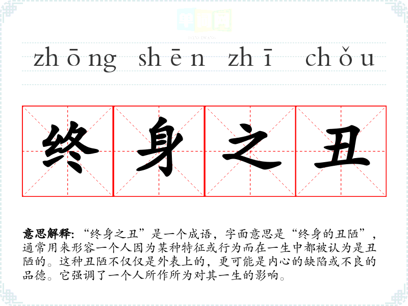 “终身之丑”是一个成语,字面意思是“终身的丑陋”,通常用来形容一个人因为某种特征或行为而在一生中都被认为是丑陋的。这种丑陋不仅仅是外表上的,更可能是内心的缺陷或不良的品德。它强调了一个人所作所为对其一生的影响。