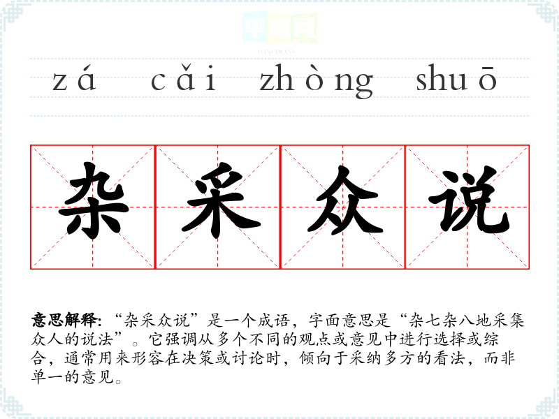 “杂采众说”是一个成语,字面意思是“杂七杂八地采集众人的说法”。它强调从多个不同的观点或意见中进行选择或综合,通常用来形容在决策或讨论时,倾向于采纳多方的看法,而非单一的意见。