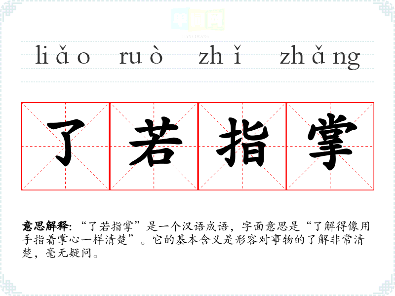 | 了若指掌 | 了:明白;指掌:指着手掌。形容对事物了解得非常清楚,象把东西放在手掌里给人家看一样。 |