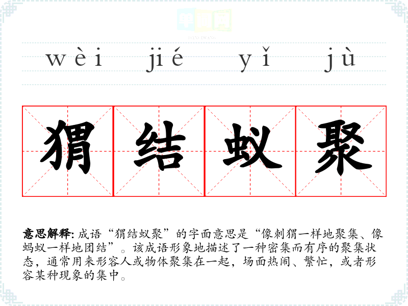成语“猬结蚁聚”的字面意思是“像刺猬一样地聚集、像蚂蚁一样地团结”。该成语形象地描述了一种密集而有序的聚集状态,通常用来形容人或物体聚集在一起,场面热闹、繁忙,或者形容某种现象的集中。