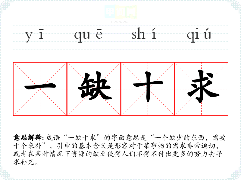 成语“一缺十求”的字面意思是“一个缺少的东西,需要十个来补”,引申的基本含义是形容对于某事物的需求非常迫切,或者在某种情况下资源的缺乏使得人们不得不付出更多的努力去寻求补充。