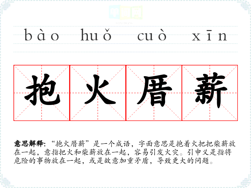 “抱火厝薪”是一个成语,字面意思是抱着火把把柴薪放在一起,意指把火和柴薪放在一起,容易引发火灾。引申义是指将危险的事物放在一起,或是故意加重矛盾,导致更大的问题。