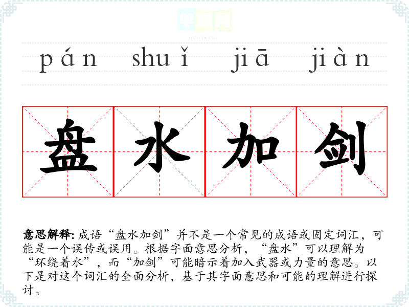 成语“盘水加剑”并不是一个常见的成语或固定词汇,可能是一个误传或误用。根据字面意思分析,“盘水”可以理解为“环绕着水”,而“加剑”可能暗示着加入武器或力量的意思。以下是对这个词汇的全面分析,基于其字面意思和可能的理解进行探讨。