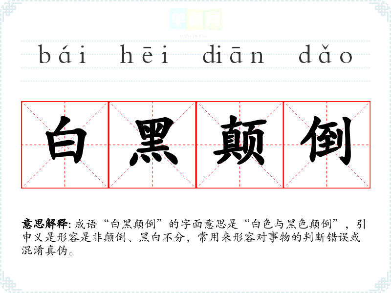 成语“白黑颠倒”的字面意思是“白色与黑色颠倒”,引申义是形容是非颠倒、黑白不分,常用来形容对事物的判断错误或混淆真伪。