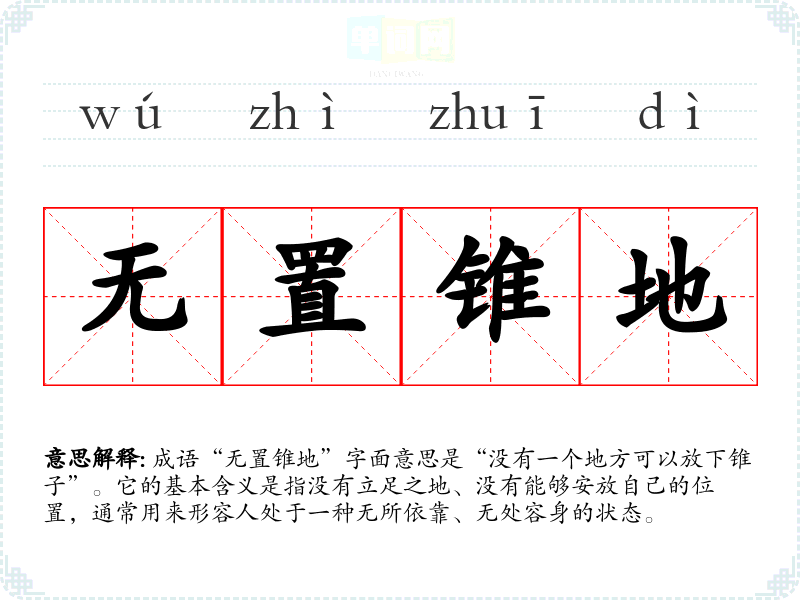 成语“无置锥地”字面意思是“没有一个地方可以放下锥子”。它的基本含义是指没有立足之地、没有能够安放自己的位置,通常用来形容人处于一种无所依靠、无处容身的状态。