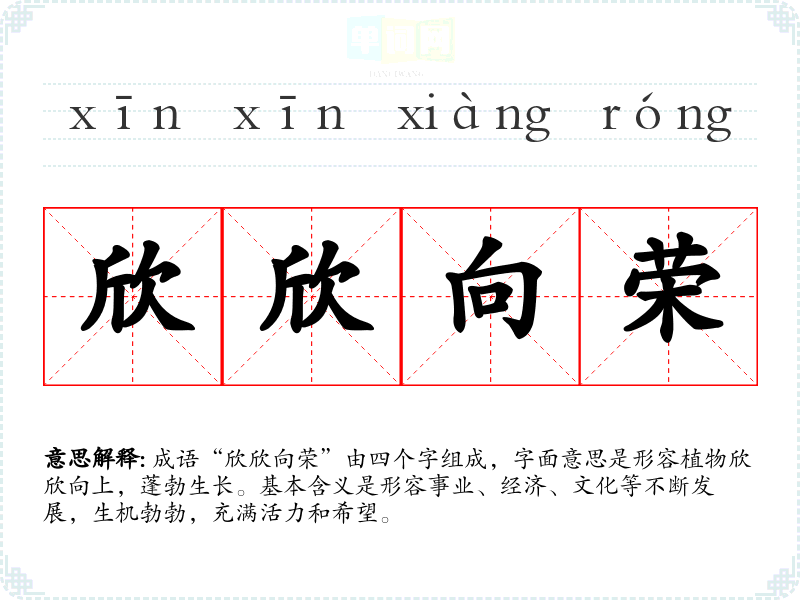 | 欣欣向荣 | 欣欣:形容草木生长旺盛;荣:茂盛。形容草木长得茂盛。比喻事业蓬勃发展,兴旺昌盛。 |