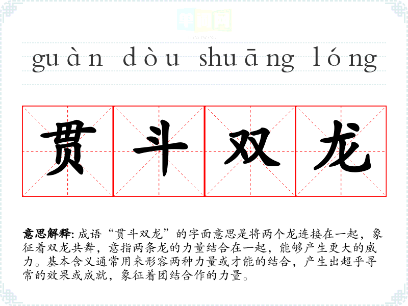 成语“贯斗双龙”的字面意思是将两个龙连接在一起,象征着双龙共舞,意指两条龙的力量结合在一起,能够产生更大的威力。基本含义通常用来形容两种力量或才能的结合,产生出超乎寻常的效果或成就,象征着团结合作的力量。