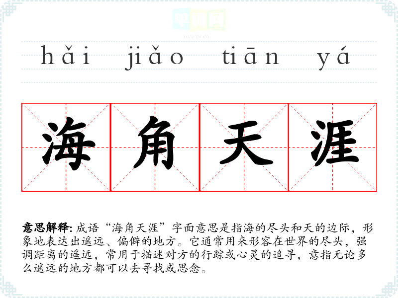 成语“海角天涯”字面意思是指海的尽头和天的边际,形象地表达出遥远、偏僻的地方。它通常用来形容在世界的尽头,强调距离的遥远,常用于描述对方的行踪或心灵的追寻,意指无论多么遥远的地方都可以去寻找或思念。