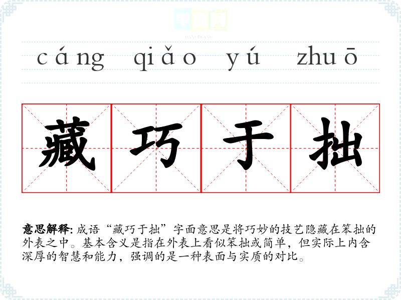 成语“藏巧于拙”字面意思是将巧妙的技艺隐藏在笨拙的外表之中。基本含义是指在外表上看似笨拙或简单,但实际上内含深厚的智慧和能力,强调的是一种表面与实质的对比。