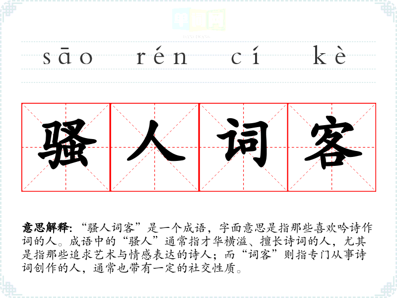 “骚人词客”是一个成语,字面意思是指那些喜欢吟诗作词的人。成语中的“骚人”通常指才华横溢、擅长诗词的人,尤其是指那些追求艺术与情感表达的诗人;而“词客”则指专门从事诗词创作的人,通常也带有一定的社交性质。