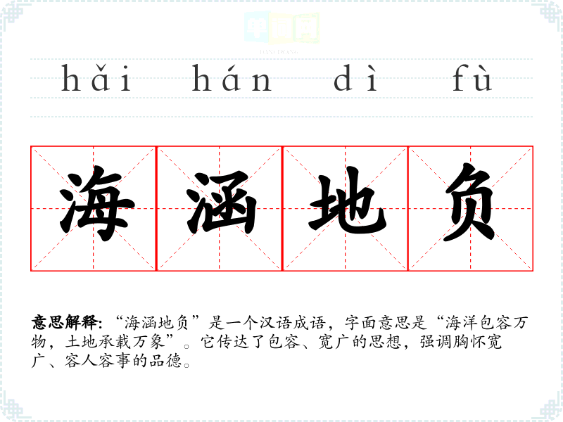 “海涵地负”是一个汉语成语,字面意思是“海洋包容万物,土地承载万象”。它传达了包容、宽广的思想,强调胸怀宽广、容人容事的品德。