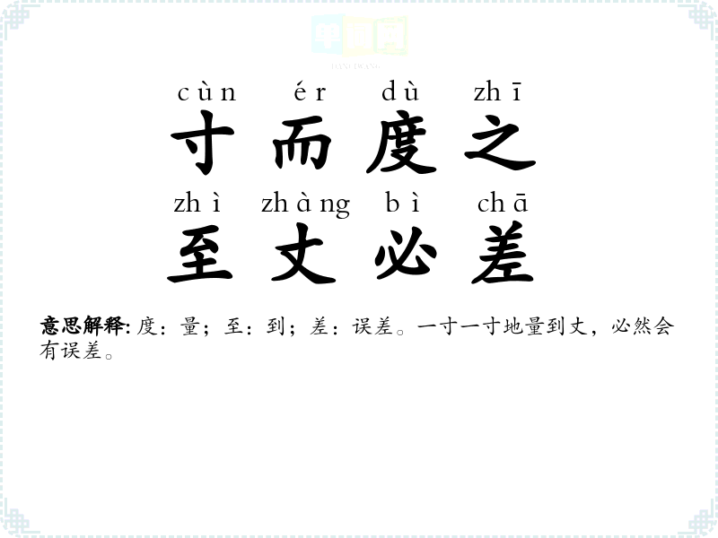 | 寸而度之,至丈必差 | 度:量;至:到;差:误差。一寸一寸地量到丈,必然会有误差。 |