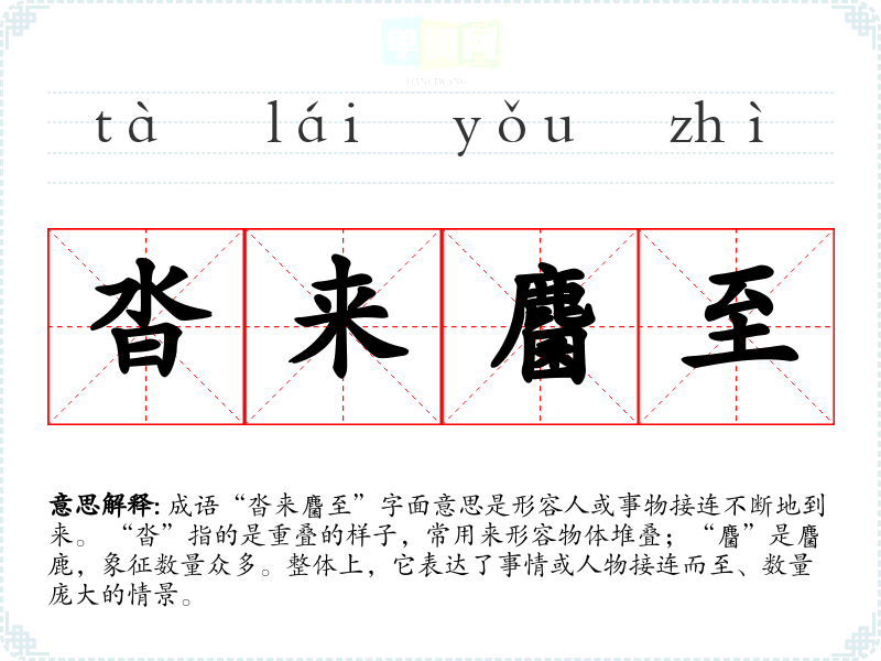 | 沓来麕至 | 指纷纷到来。同“沓来踵至”。 |
