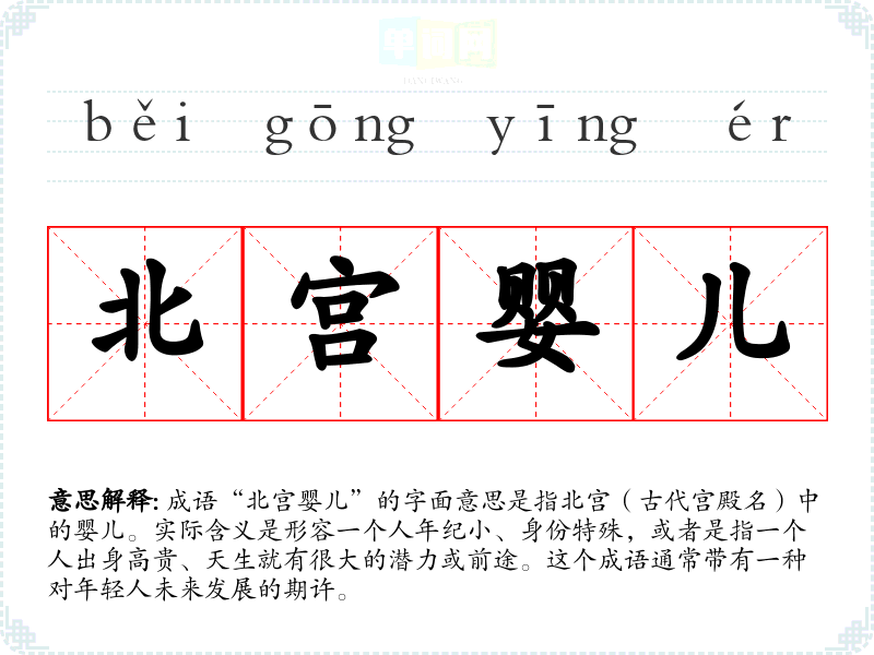 成语“北宫婴儿”的字面意思是指北宫(古代宫殿名)中的婴儿。实际含义是形容一个人年纪小、身份特殊,或者是指一个人出身高贵、天生就有很大的潜力或前途。这个成语通常带有一种对年轻人未来发展的期许。