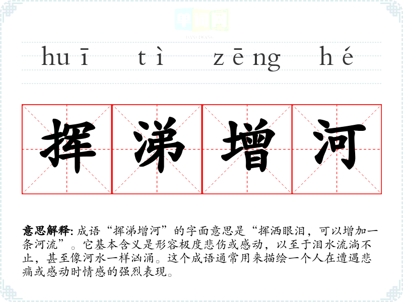 成语“挥涕增河”的字面意思是“挥洒眼泪,可以增加一条河流”。它基本含义是形容极度悲伤或感动,以至于泪水流淌不止,甚至像河水一样汹涌。这个成语通常用来描绘一个人在遭遇悲痛或感动时情感的强烈表现。