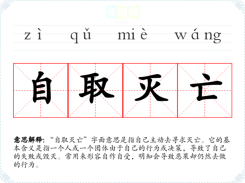 “自取灭亡”字面意思是指自己主动去寻求灭亡。它的基本含义是指一个人或一个团体由于自己的行为或决策,导致了自己的失败或毁灭。常用来形容自作自受,明知会导致恶果却仍然去做的行为。
