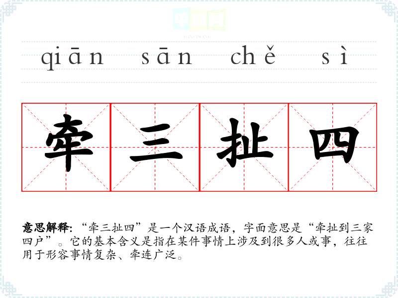 “牵三扯四”是一个汉语成语,字面意思是“牵扯到三家四户”。它的基本含义是指在某件事情上涉及到很多人或事,往往用于形容事情复杂、牵连广泛。