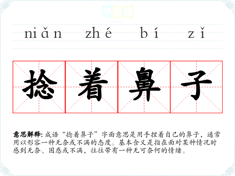 成语“捻着鼻子”字面意思是用手捏着自己的鼻子,通常用以形容一种无奈或不满的态度。基本含义是指在面对某种情况时感到无奈、困惑或不满,往往带有一种无可奈何的情绪。