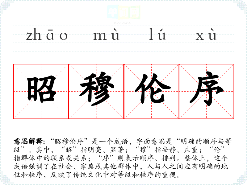 “昭穆伦序”是一个成语,字面意思是“明确的顺序与等级”。其中,“昭”指明亮、显著;“穆”指安静、庄重;“伦”指群体中的联系或关系;“序”则表示顺序、排列。整体上,这个成语强调了在社会、家庭或其他群体中,人与人之间应有明确的地位和秩序,反映了传统文化中对等级和秩序的重视。